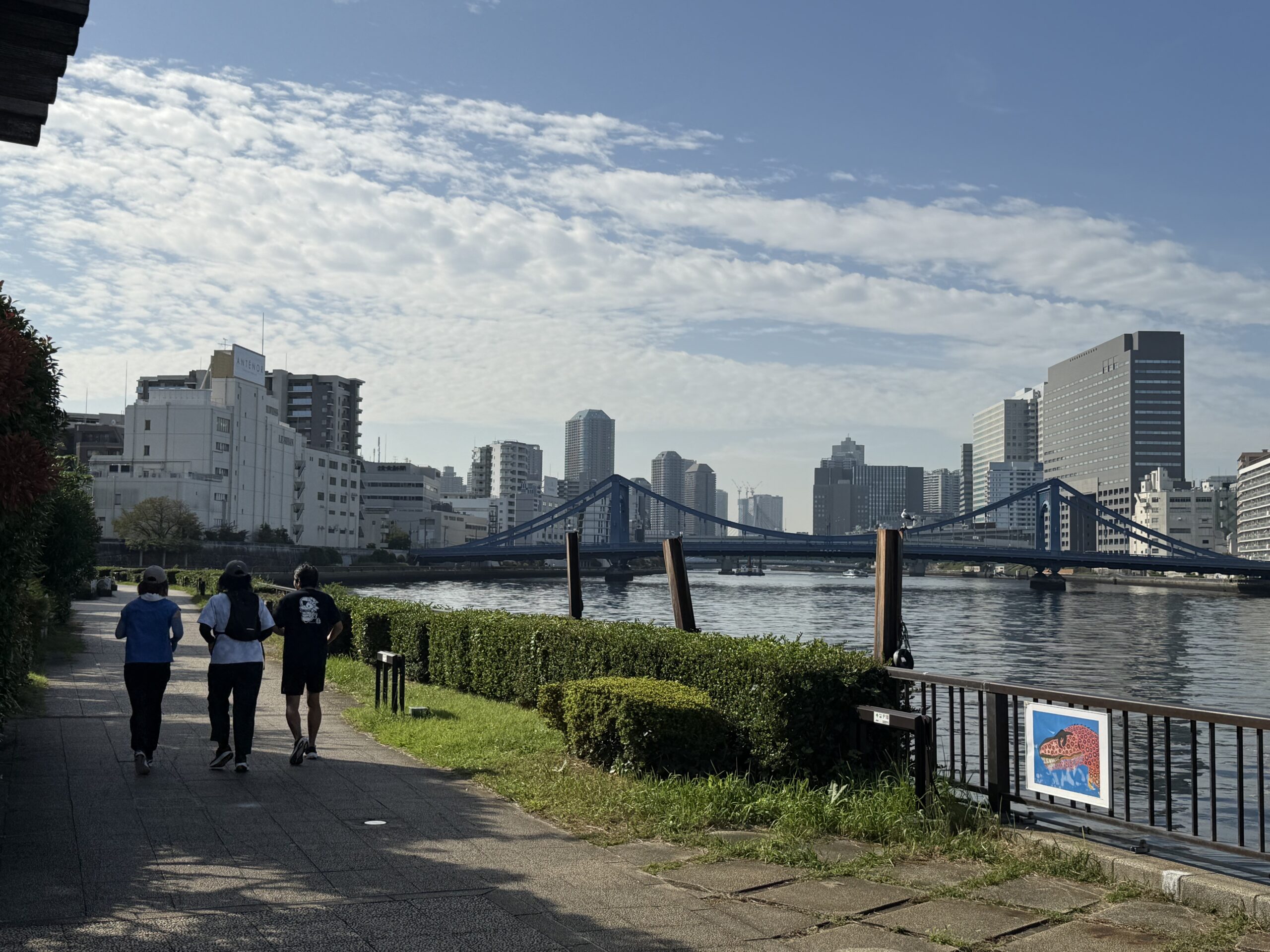 清澄公園内でスロージョギングの基本的な走り方をレクチャーして、公園内500Ⅿを2周ほど走ります。その後、公園をでて墨田川テラスに向かい、両国橋方面に走り折り返します。途中、給水、小休憩をとりながら、風景を楽しみながら走ります。