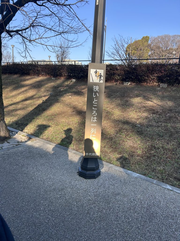 皇居外周の歩道は道幅が狭くなるところがあります。ここはグループで走っている場合は1列になります。お話をしながら走れるスロージョギングはここではしない方がよさそうです。1列で走りに集中します。ちなみにスロージョギングはニコニコしながらお話が出来るようなスピードで走るのですが、お話をしながら走らなくても大丈夫です。走りに集中できるところはフォームなどを再確認するのも楽しいと思います。