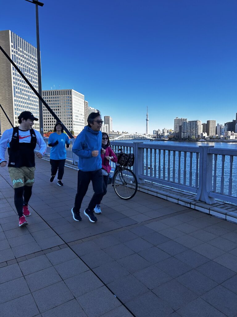 笑顔で走れるのがスロージョギングの魅力のひとつ。奥にはスカイツリーが見えます。