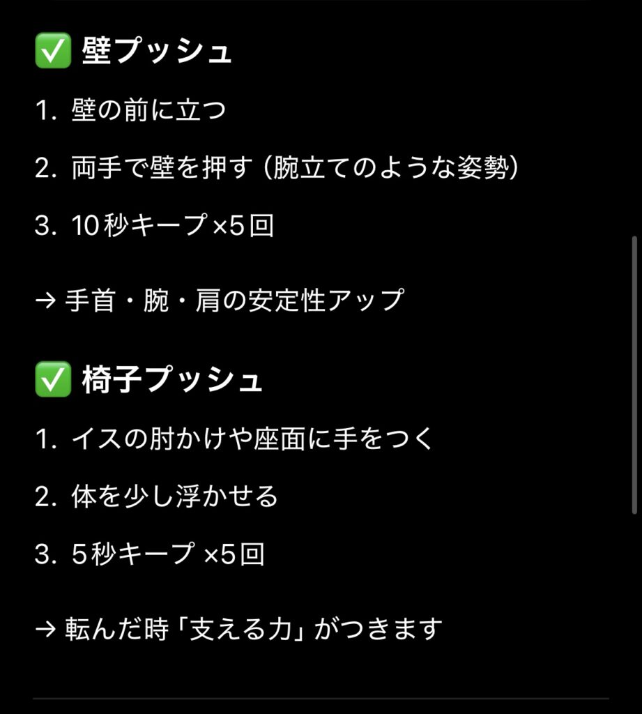 また、一番危険な事は転倒による大けがや骨折です。特に年配の方は注意が必要です。とっさに手が前にでないで顔を大けがしてしまったり、手はつけたものの、ついた手が衝撃で骨折してしまったりと転ぶことによるダメージはとても大きいです。せっかく、健康の為に始めたジョギングで転んで大けがをしてしまったら、それこそ本当に本末転倒です。もちろん、ランニングやジョギングでも転倒のリスクはありますが、それらに比べて、スロージョギングは冒頭で申し上げたとおり、「年配の方でもはじめやすい」のです。今回は転んだときに、重大な事故やケガにならないように、手がでて自らを防御できるようなエクササイズをご紹介致します。楽しいスロージョギングを続けられるように、自らを転倒から守りましょう。
