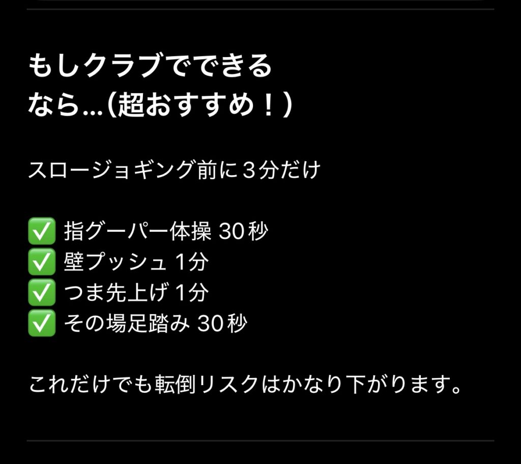 健康やフレイル対策などに効果的で中高年以上の方や、年配の方でも始めやすく魅力的なスロージョギングですが、ひとつ気を付けて頂きたい事があります。それは【転ばないこと】。特に年配の方は注意が必要です。スロージョギング自体は安全な方法の走り方なので、転びにくい走法ではあるのですが、誰しも、不意に転んでしまうことがあります。また、スロージョギングでは「ニコニコペースで走りましょう」と伝えております。ニコニコペースとは、ニコニコ笑顔を保ちながらとなりの人とお話ができるような苦しくない速度で走れるペースということです。ここにも実は少し危険な落とし穴があると思います。お話ができるペースということで実際に隣の人との会話に夢中になってしまい、足元への注意が散漫になってしまい転倒しやすくなってしまうのです。